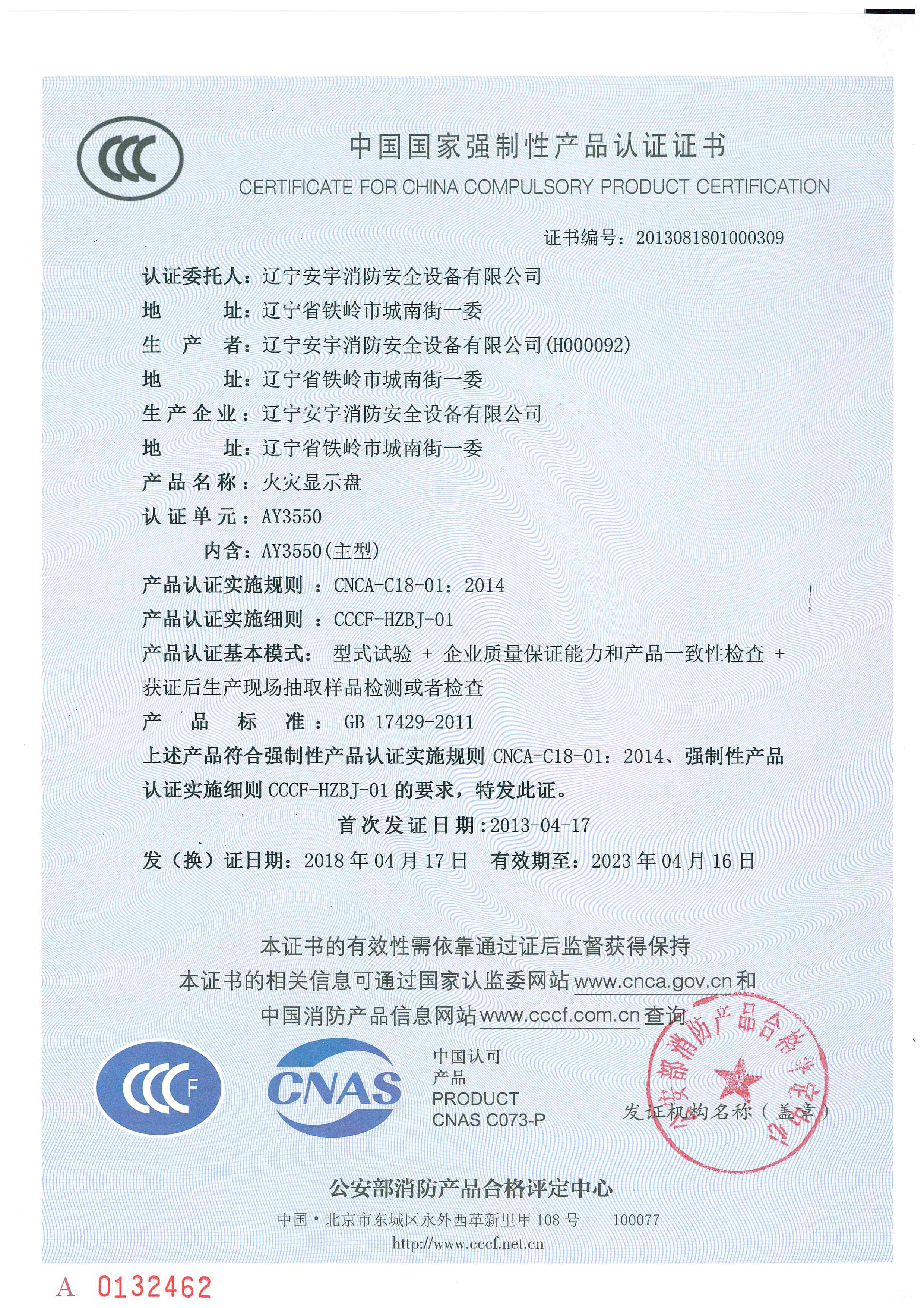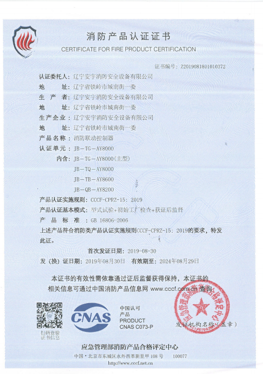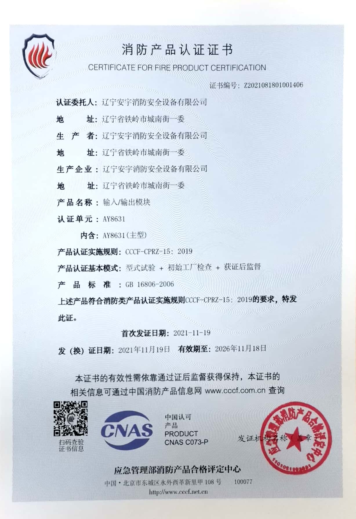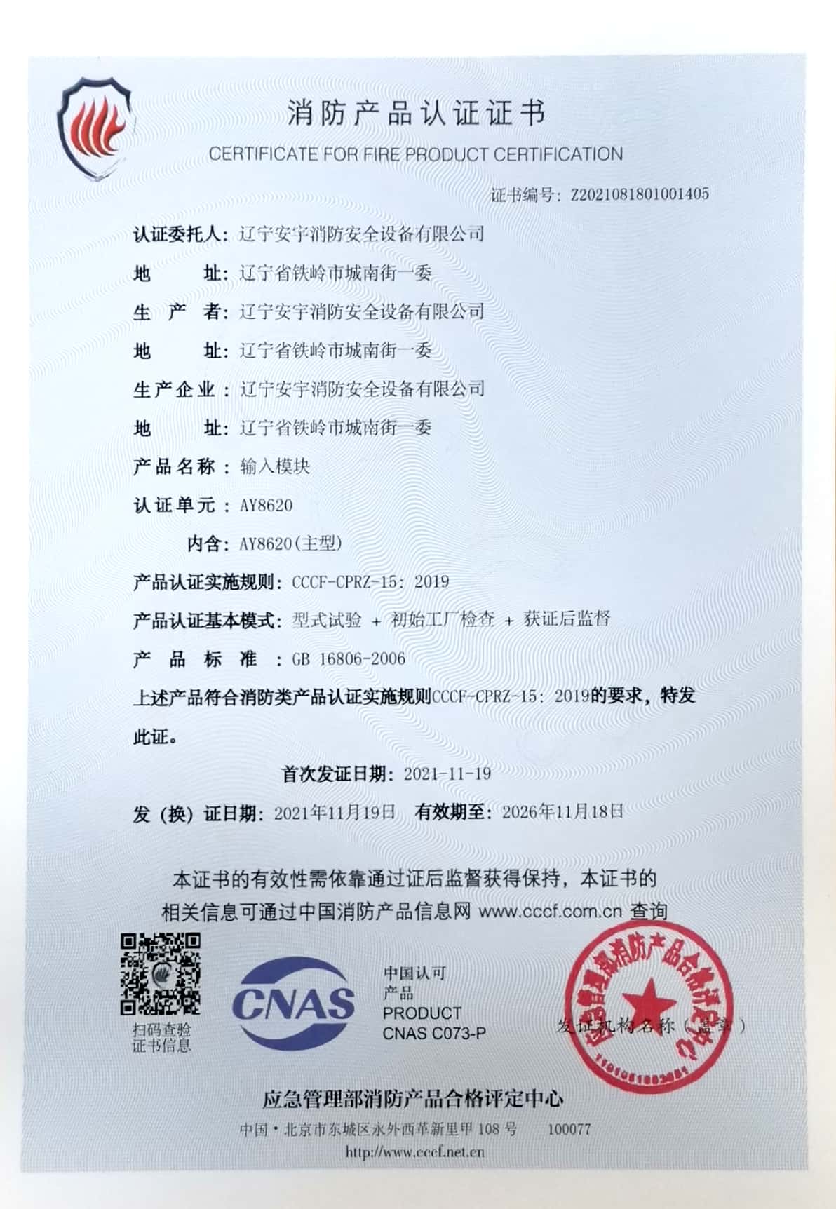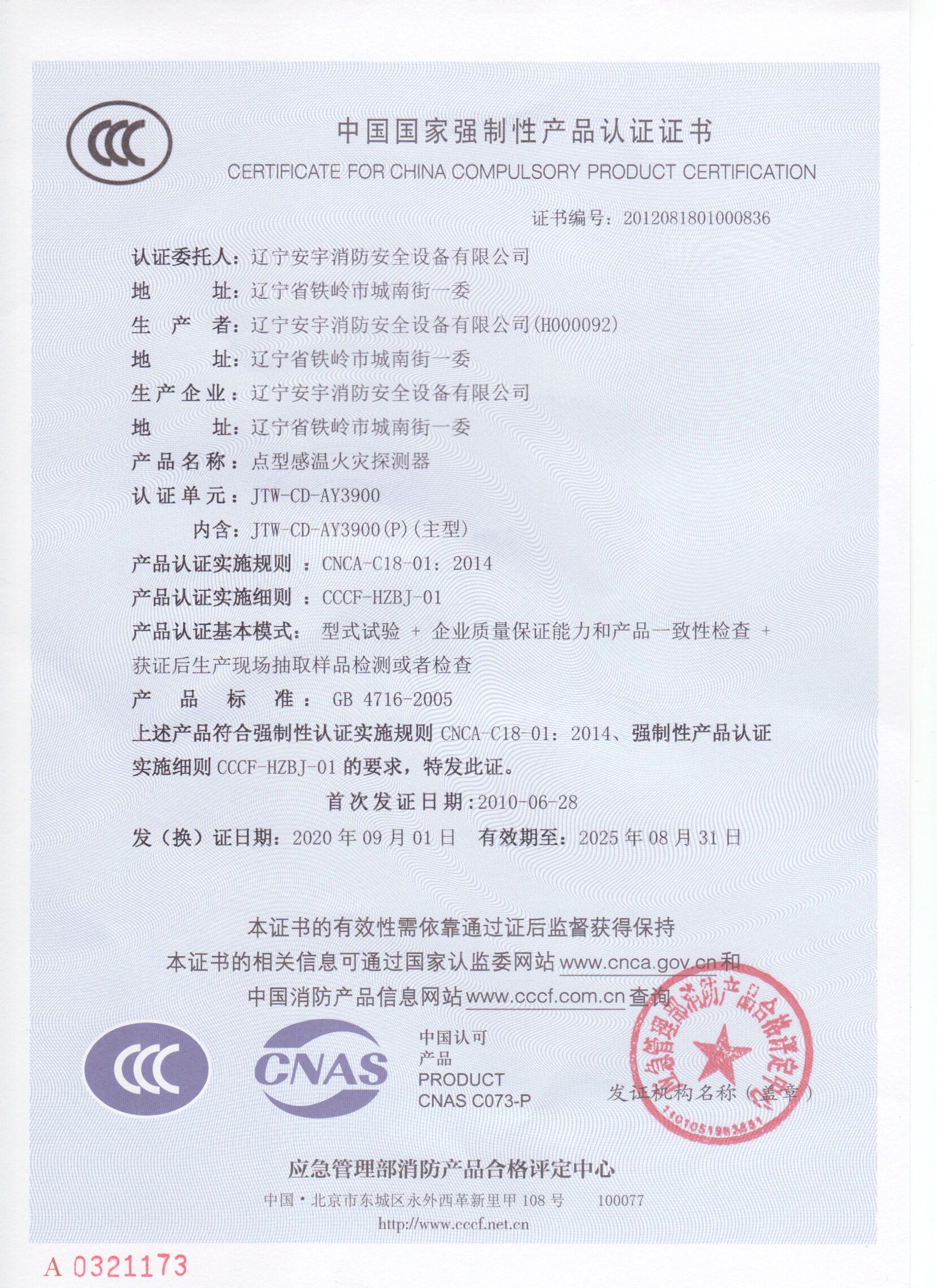 公司以高素質的職業化人才隊伍、完善的現代化管理機(jī)製和質量管理體係,獲得了中國(guó)認證機構國家認可委員會(CNAB)認可的中(zhōng)國質量認證中心(xīn)(CQC)質量(liàng)管理體(tǐ)係認證公安部消防產(chǎn)品合格評定中心的產(chǎn)品質量認證中國強製性產品認證(China Compuisory Certification ,簡稱3C)認證(zhèng),使安宇產品在技術含量及產品(pǐn)的質量和穩定性方麵始終處於國(guó)際同行業前端水平。