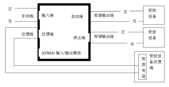 ·與消防聯動控製器(qì)中的手動控製單元相連接,屬於二線製輸入輸出模(mó)塊,不需另接24V電源;具有二組有源輸出。能夠實現對外部設備的啟動、停止(zhǐ)控製,同時能夠接收相(xiàng)應反(fǎn)饋狀態,並將設備的動作狀態傳送給消(xiāo)防聯動控製器(qì)。 能夠檢測模塊對外連接(jiē)線的通斷狀態。該產(chǎn)品與本公司生產的各種型號消防聯(lián)動控製器配(pèi)套使(shǐ)用。